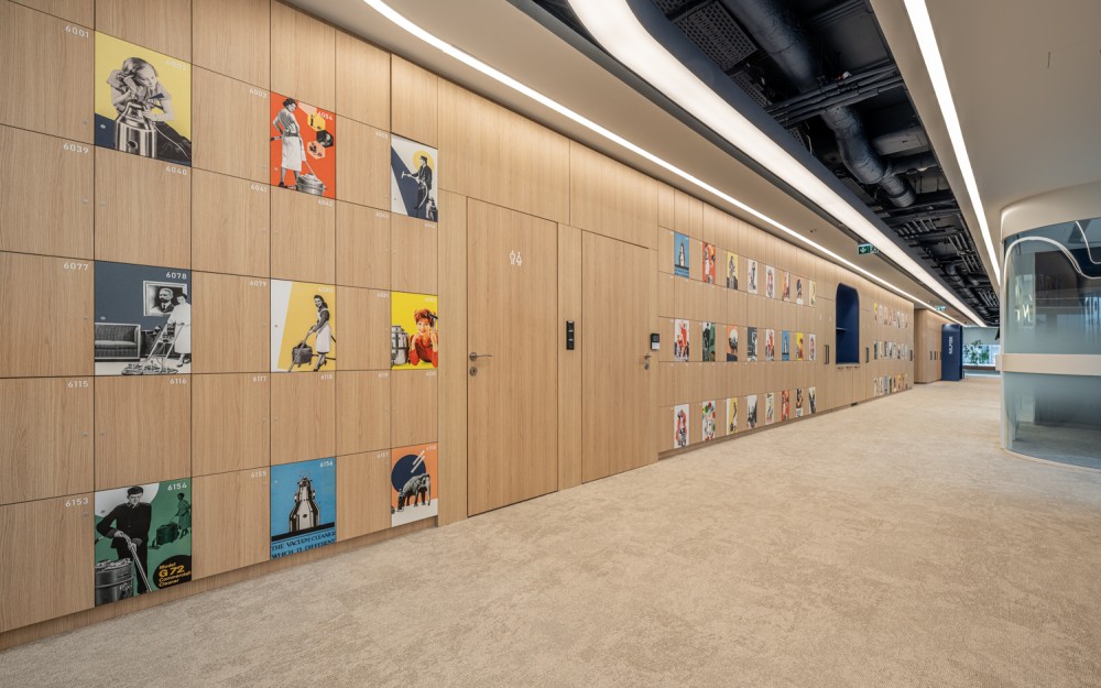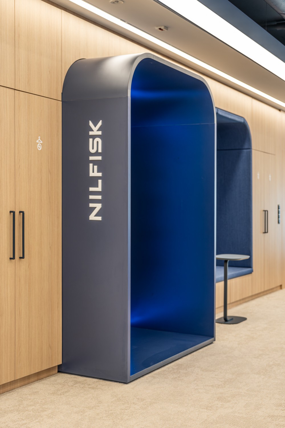 A design finoman, indirekt módon jeleníti meg a Nilfisk márkát. A skandináv életérzést nem nagy logókkal és harsány arculati elemekkel, hanem anyaghasználattal, színvilággal és térszervezéssel közvetíti. A natúr tölgy, a fémes részletek és a visszafogott színek nyugodt, kiegyensúlyozott atmoszférát teremtenek, amely a dán munkakultúra lényegét – a bizalomra és együttműködésre épülő munkavégzést – tükrözi. A vállalat gazdag történetét és innovatív örökségét pedig archív poszterek és korabeli hirdetések idézik meg, amelyek a közösségi terek és öltözőszekrények felületein kaptak helyet.