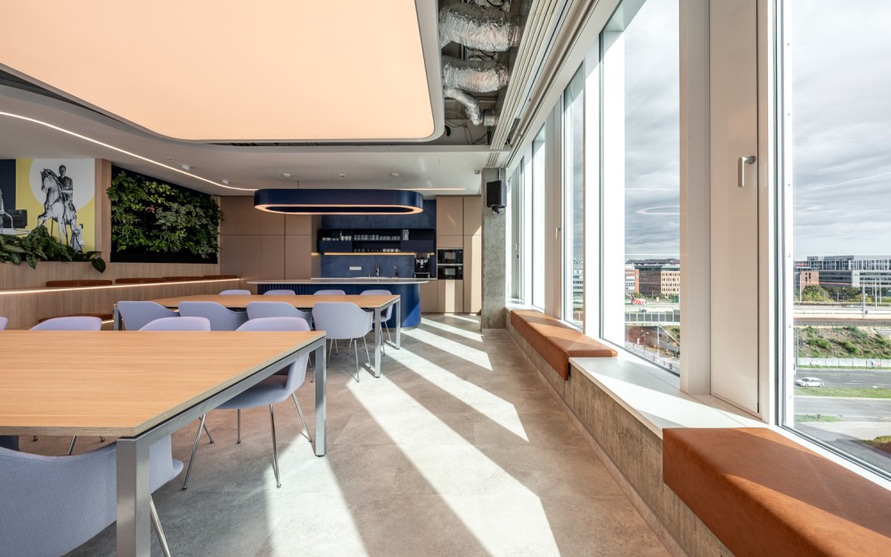 Az új Nilfisk iroda két szinten helyezkedik el. A 6. emelet különlegességét nemcsak a Kopaszi-gátra és a folyó kettéágazó szakaszára nyíló páratlan kilátás adja, hanem az is, hogy a másik oldalon a Gellért-hegy látványa teszi teljessé a panorámát. Itt kapott helyet a közösségi konyha, több inspiráló, kreatívan kialakított tárgyaló – melyek ötletes, dán szavakat viselnek, mint például Ild vagy Aurora –, valamint számos vállalati részleg is ezen a szinten működik. A 4. emeleten a nyugodt, koncentrált munkára tervezett terek kaptak helyet, a belső kertre néző kilátással.