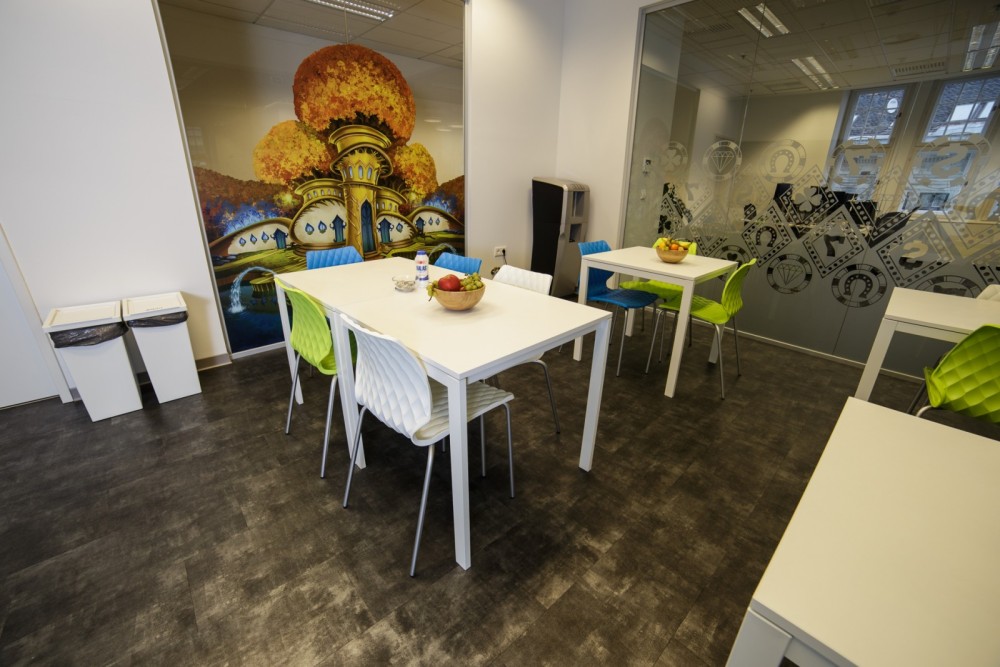 Az irodánkban található üvegfelületek grafikus kollegáink elképzelései alapján kerültek fóliázásra. A felületre felkerült grafikák hűen tükrözik a vállalkozásunk által végzett tevékenységet. Kaszinó zsetonok köszönnek vissza a nagyobb tárgyalónk és a konyhánk falán. Emellett az egyik játékunk háttere színesíti a konyhánkat és a kreatív szobánkat elválasztó falat, valamint egy másik játékunk karakterei szeparálják a teret az open office területén. Vállalkozásunk számára kiemelten fontos a dolgozóink elégedettsége, folyamatos visszajelzésük nagyon fontos számunkra. A teljes kivitelezési folyamat során meghallgattuk véleményüket, javaslataikat, így sikerült egy minden igényét kielégítő irodát megálmodnunk közösen.