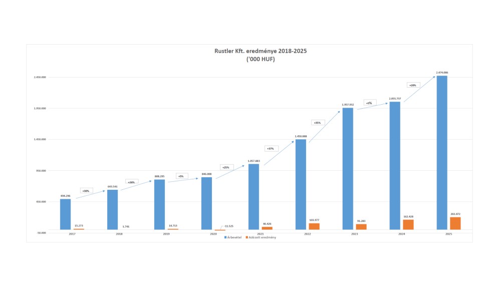 A 2018 és 2025 közötti időszakban a Rustler Kft. árbevétele több mint ötszörösére nőtt, 2025-ben pedig meghaladta a 2,4 milliárd forintot. A növekedés nemcsak volumennövekedést jelentett, hanem javuló eredményességet is: az adózott eredmény 2025-ben átlépte a 200 millió forintot, közel 8%-os EBIT-tel, amely a piaci átlag közel kétszerese. Ez a teljesítmény különösen annak fényében jelentős, hogy a Rustler működése alapvetően ügyfélorientált és szolgáltatás-intenzív, így az eredményesség a megbízható, hatékony szervezetnek és folyamatoknak köszönhető.