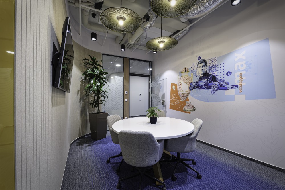 A tervezést egy vállalaton belüli stakeholder-csapat kísérte végig, biztosítva, hogy minden részleg érdekei érvényesüljenek. A koncepció három fő szempontot ötvözött: fenntarthatóság, emberközpontúság és a funkcionalitáshoz való alkalmazkodás. A kialakításnál kreatív, tartalmi alapú koncepcióban gondolkodtunk, amely önmagában ad erős vizuális identitást. Így született meg az a több rétegben felépített narratíva, amely a holland és magyar kultúra, művészet, sport és gasztronómia kapcsolódási pontjait jeleníti meg a különböző kollaborációs terekben. Az egyik tárgyalóban Van Gogh és Rippl-Rónai impresszionista világa találkozik, egy másikban Max Verstappen 2023-as malőrje kerül újraértelmezésre Herendi porcelánmotívumokkal, máshol pedig Puskás Ferenc és Johan Cruyff kapott közös falat. A tematikák között megjelenik továbbá az Északi-tenger és a Balaton, a fapapucs és a csizma, vagy éppen a muskátli és a tulipán párhuzama is, játékos és edukatív módon gazdagítva a munkakörnyezetet.