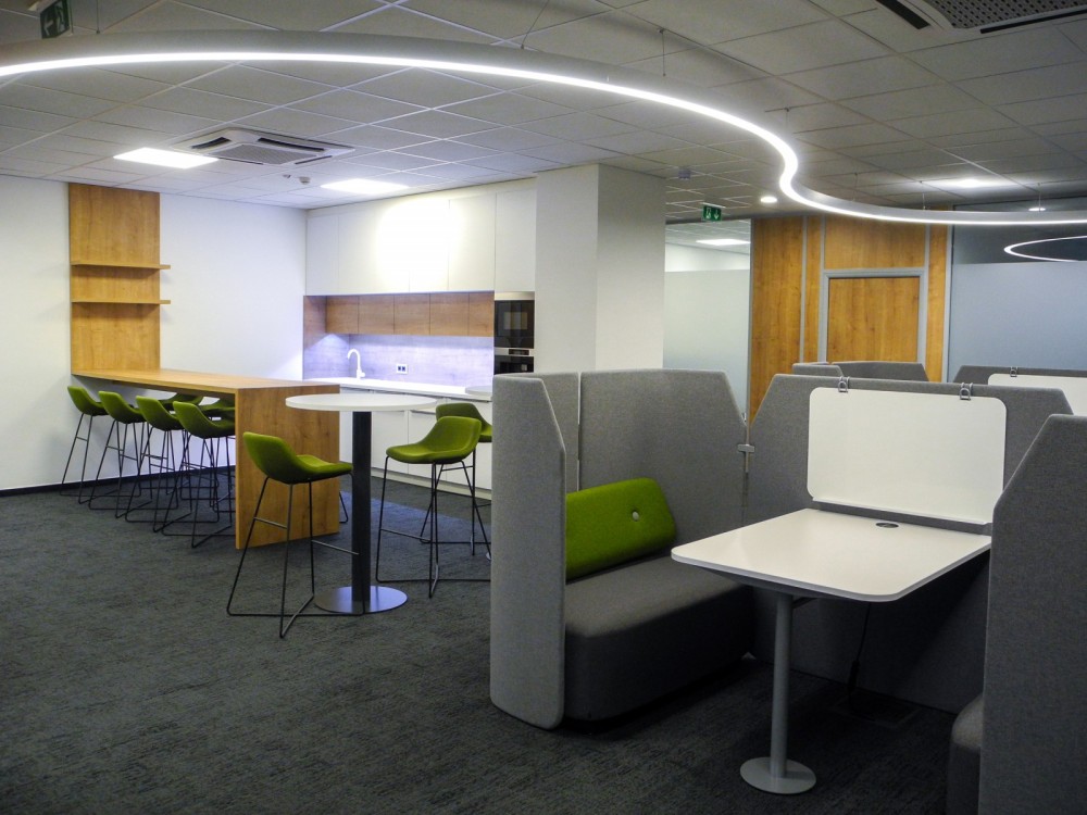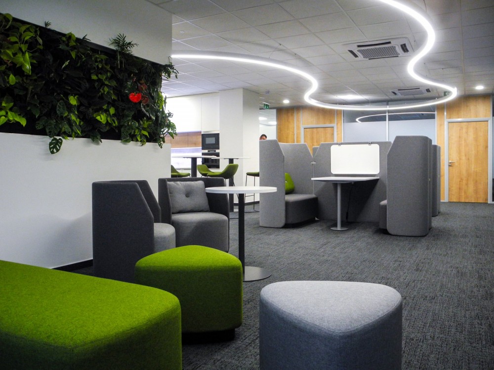 Elhelyeztünk akusztikus bútorelemeket is, amelyek 4 fős mini tárgyalóként is funkcionálnak, valamint itt található egy ülőbútorokból álló csoport, amely szintén alkalmas egyéni munkavégzésre.