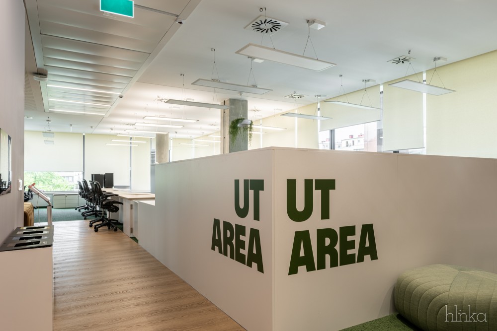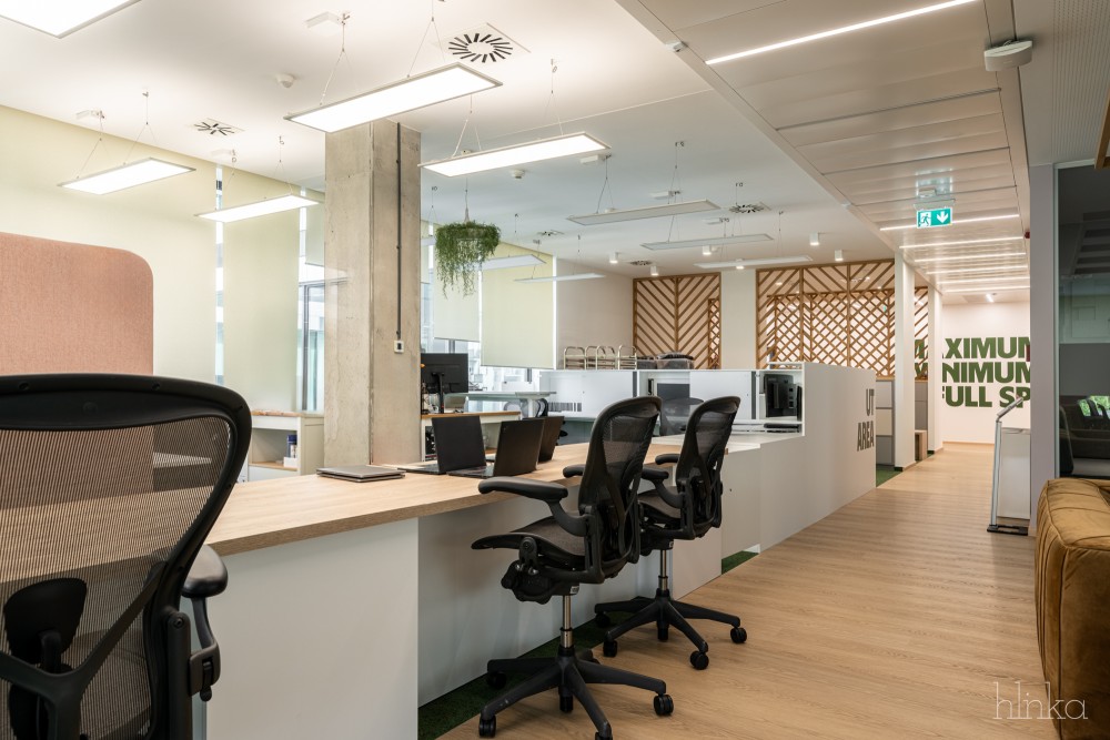 A kékből zöldre váltó Wise brand vizuális elemei és signage megoldásai teljeskörűen beépültek az irodába, új színt és karaktert adva a munkahelyi környezetnek.