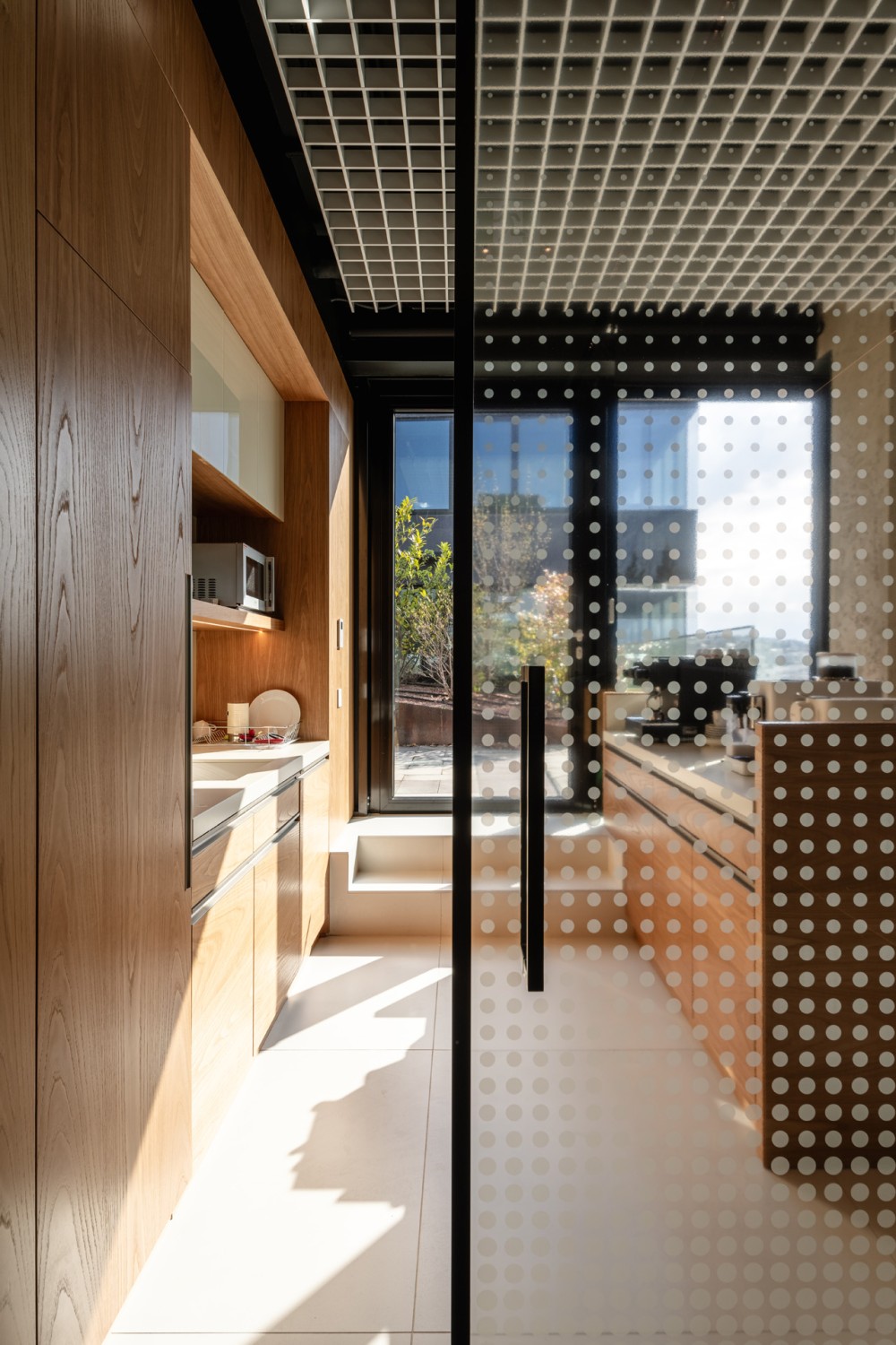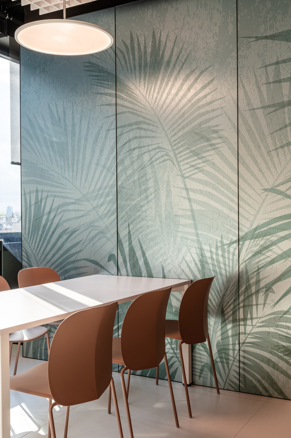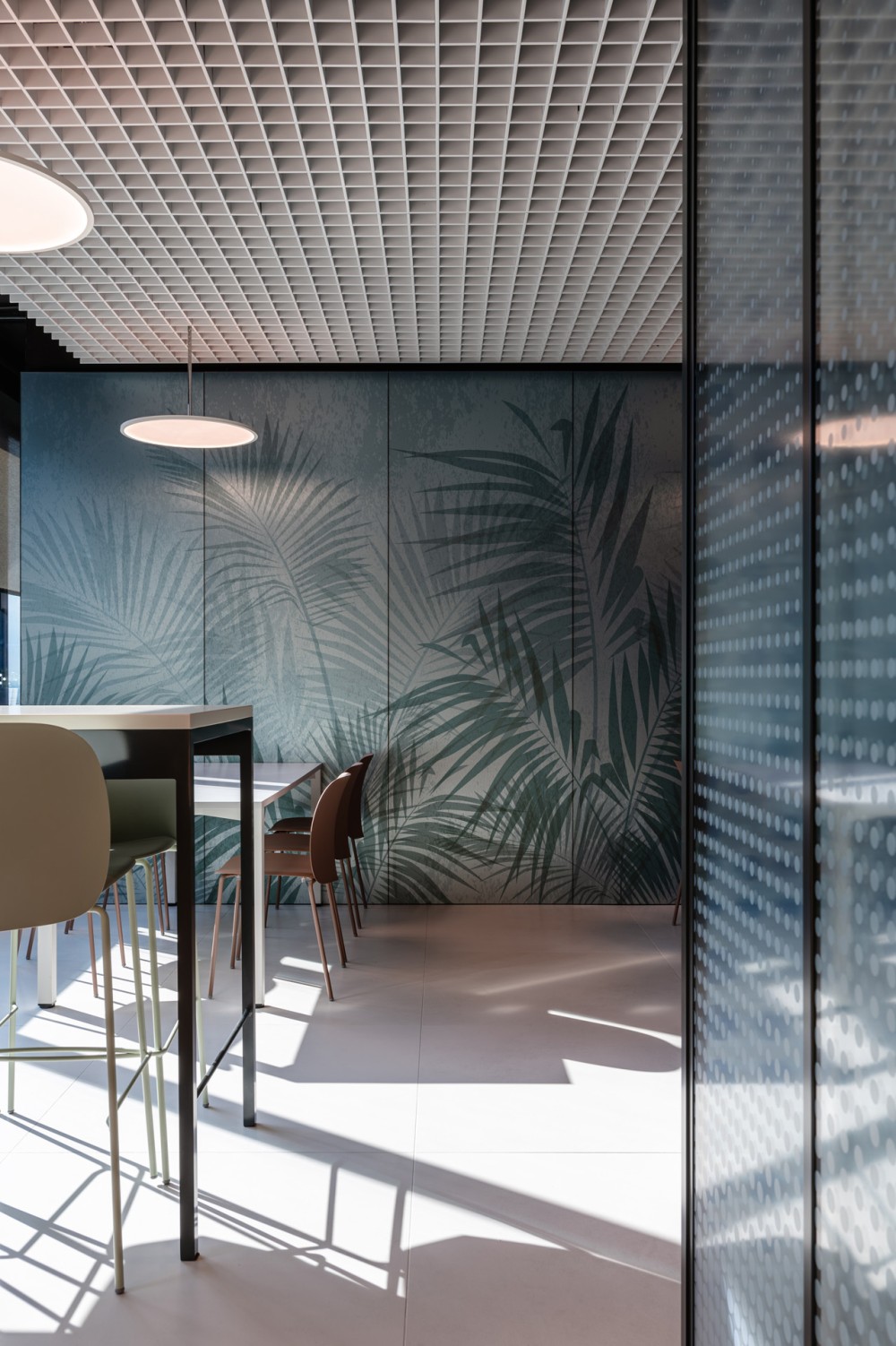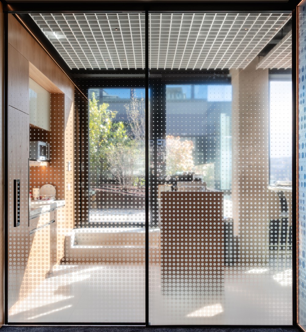 A teakonyha tere az iroda „közösségi pálmaháza”: az egyedi grafikával megoldott tér célja a munkából való kikapcsolás és a közösségi interakció támogatása. Az egyedi kávépulttal kiépített tér a rugalmas átrendezhetőséggel kialakított, a kapcsolódó nagyméretű tetőterasszal együtt a találkozások színtere.