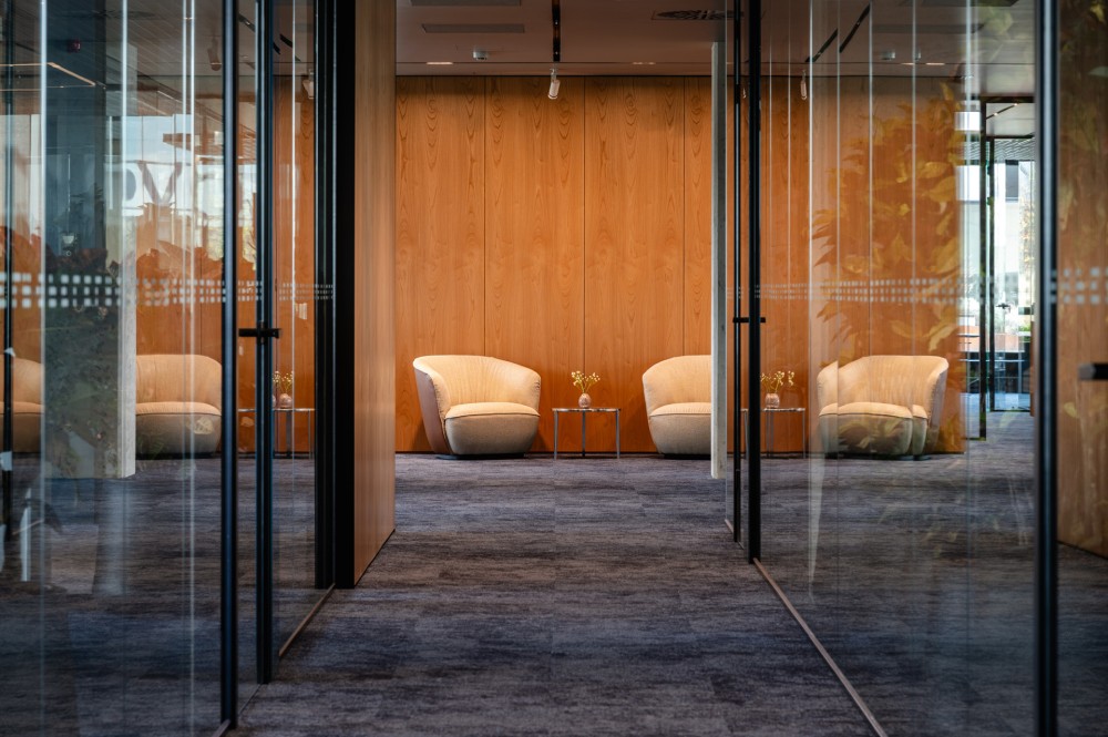 Az iroda kialakítása ötvözi a klasszikus irodaterek nyugalmát, biztonságot adó ergonómiáját a legújabb innovációs lehetőségekkel: