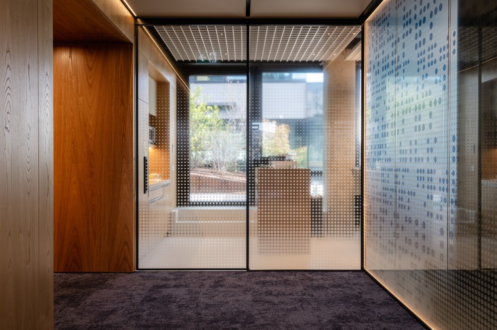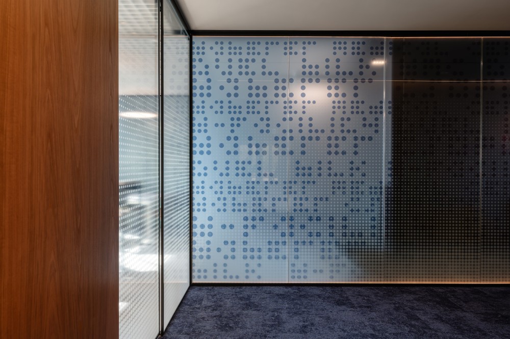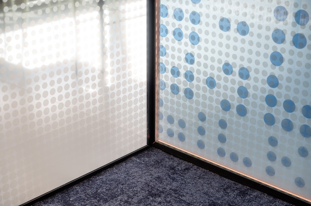 Az irodaterekben alkalmazott üveggrafikáknak összetett szerep jutott: Egyrészről a tér érzékelését és észlelését módosító szándékok formálták ezeket, rejtett világítással: egyszerre térhatároló és tértágító szerepük van. Ezen túlmenően absztrakt művészeti alkotásokként a gyógyászati és vállalati identitást, az irodában jelen lévő brandeket és a mai kor szellemiségét közvetítik.