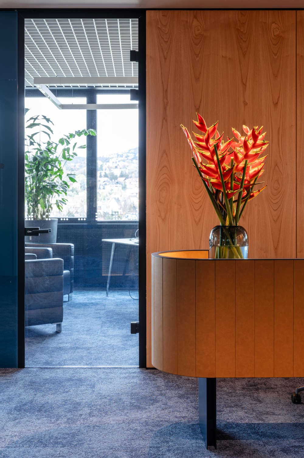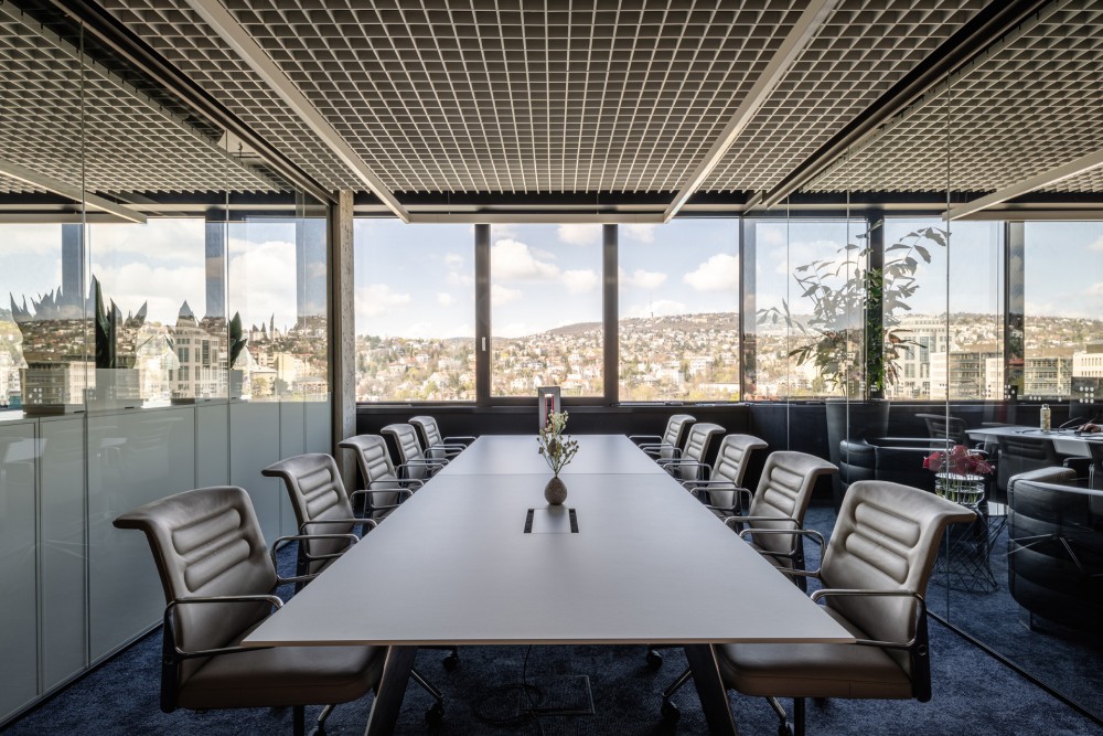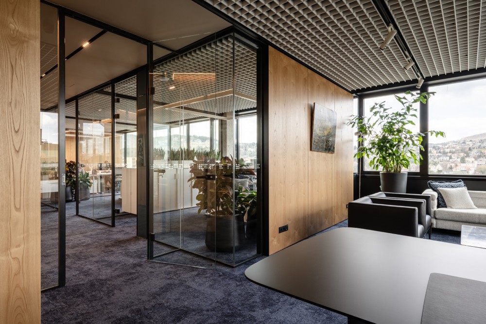 A terek üveg falai nem gátolják a teljes körben feltáruló budai hegyek panorámáját, a környezet és az égbolt kék-zöld hangsúlyát az iroda belsőséges meleg atmoszférával egészíti ki. A belső tér egyszerre elegáns és játékos, nyugodt és inspiráló, klasszikus és kortárs. Az unikális falburkolatok, beépített bútorok és az értékálló mobil bútorozás egyedi karaktert és magas szintű ergonómiát biztosítanak az irodaterek használóinak és vendégeinek.