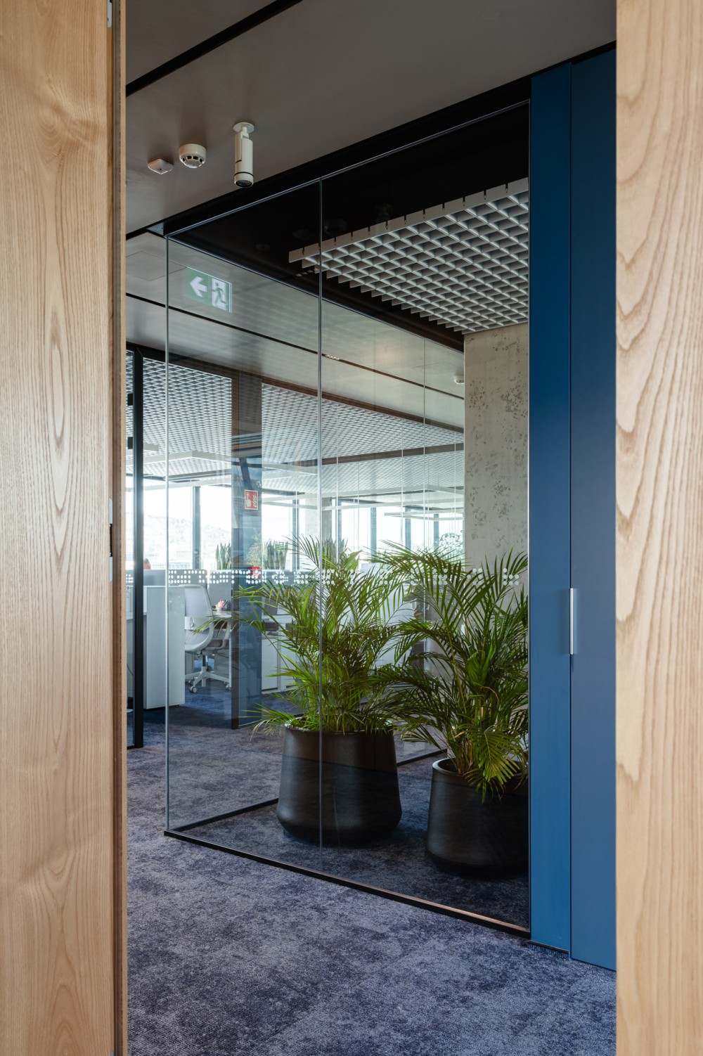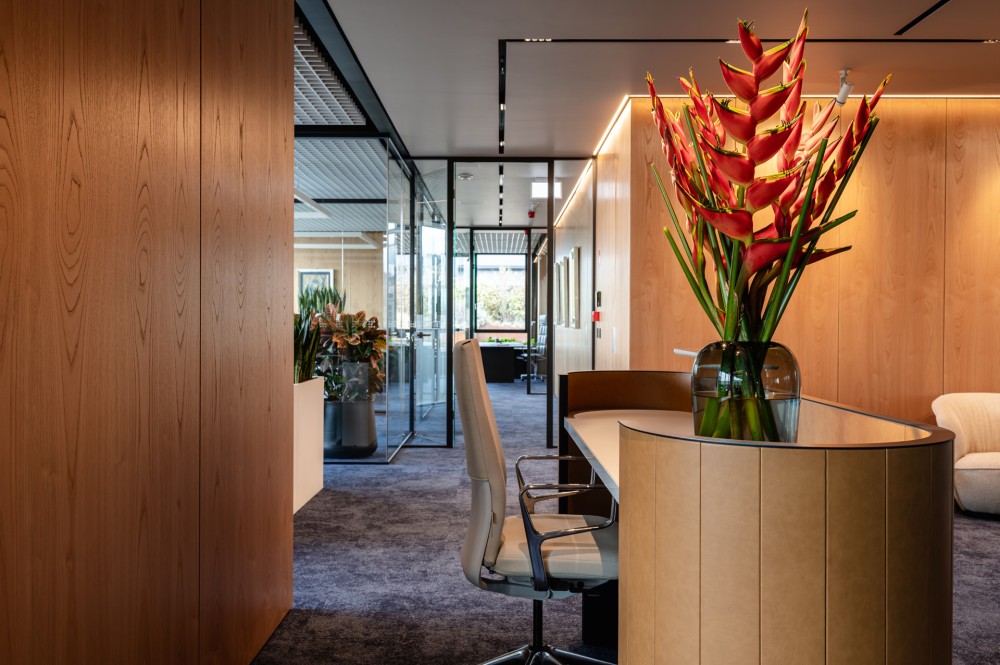 Az alkalmazott fa felületek szerepe összetett. Funkcionális szerepben a falburkolatként és rejtett bútorként megjelenő fa-furnér táblák takarják a gépészeti, IT és kiszolgáló helyiségeket, az üzemeltetési, a ruhatári és a raktározási funkciókat. A csodálatos rajzolattal rendelkező gesztenye fa kiemeli a terek fókuszpontjait, továbbá színvilágában meleg kontrasztot képez a körbevevő kék és zöld felületeknek. Összességében a színegyüttes megnyugtató érzetet sugároz a kiegyensúlyozott munkavégzéshez.