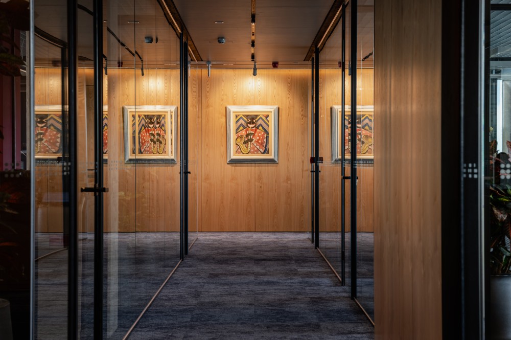 A munkatársakat körbevevő művészeti alkotásokat múzeumi szintű megvilágítás kelti életre. A festményeknek a terek mindenki által élvezhető fókuszaiba, a nemes gesztenyefa felületek elé, képakasztó sínek alkalmazásával lettek installálva.